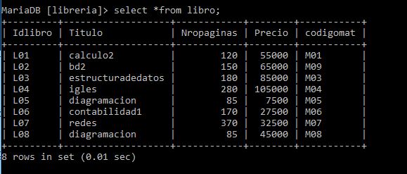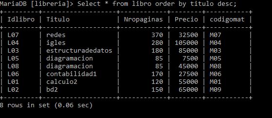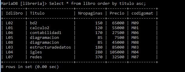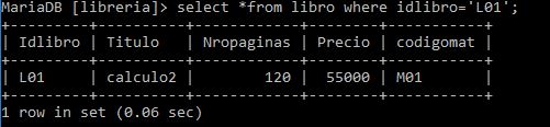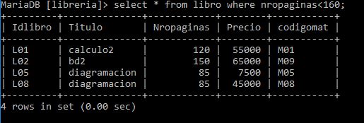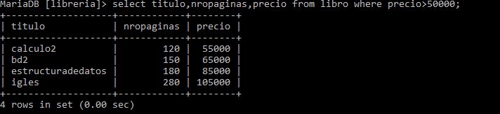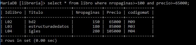 Sintaxis: select * from libro where nropaginas>=100 and precio>=65000;