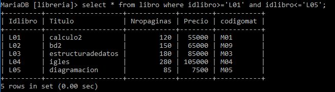 consicion(es): codigo>='L01' and idlibro<='L05';