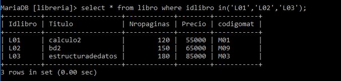 select * from libro where idlibro in('L01','L02','L03');