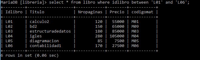 select * from libro where id libro between 'L01' and 'L06';