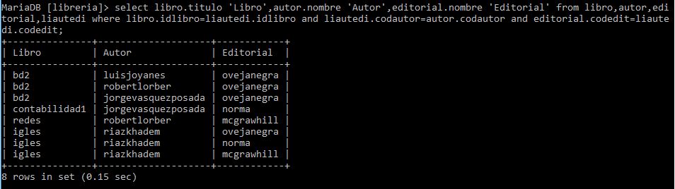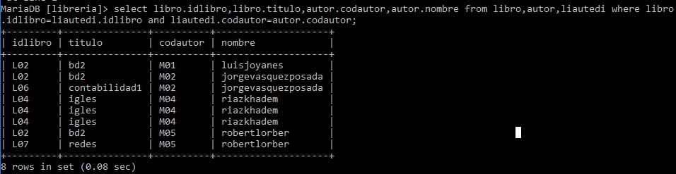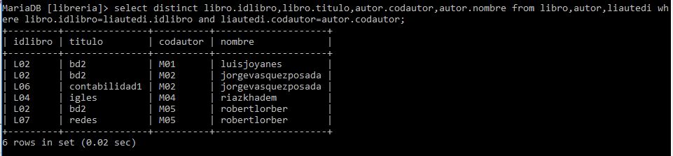 libro.idlibro,libro.titulo,autor.codautor,autor.nombre from libro,autor,liautedi where libro.idlibro=liautedi.idlibro and liautedi.codautor=autor.codautor;