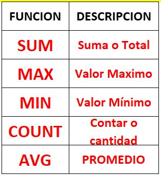 Select funcion(valor o campo) from nombretabla;