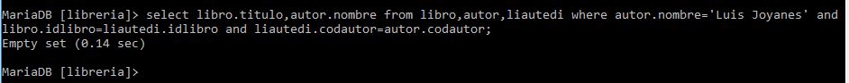 select libro.titulo,autor.nombre from libro,autor,liautedi where autor.nombre='Luis Joyanes' and libro.idlibro=liautedi.idlibro and liautedi.codautor=autor.codautor;