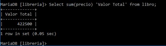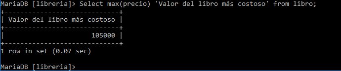 Ej: Cual es el valor promedio de los libro que vende la librería select avg(precio) 'Valor promedio de los libros' from libro;