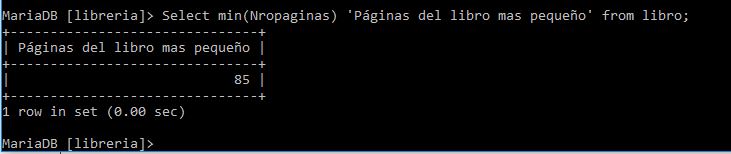 Select min(nropagina) 'Páginas del libro mas pequeño' from libro;